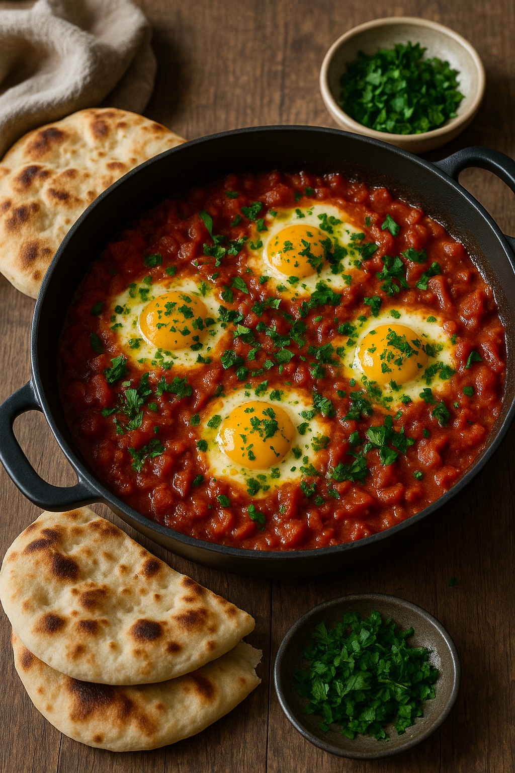 5. Anrichten: Mit frischer Petersilie und optional Feta bestreuen, mit Brot servieren und direkt aus der Pfanne genießen.